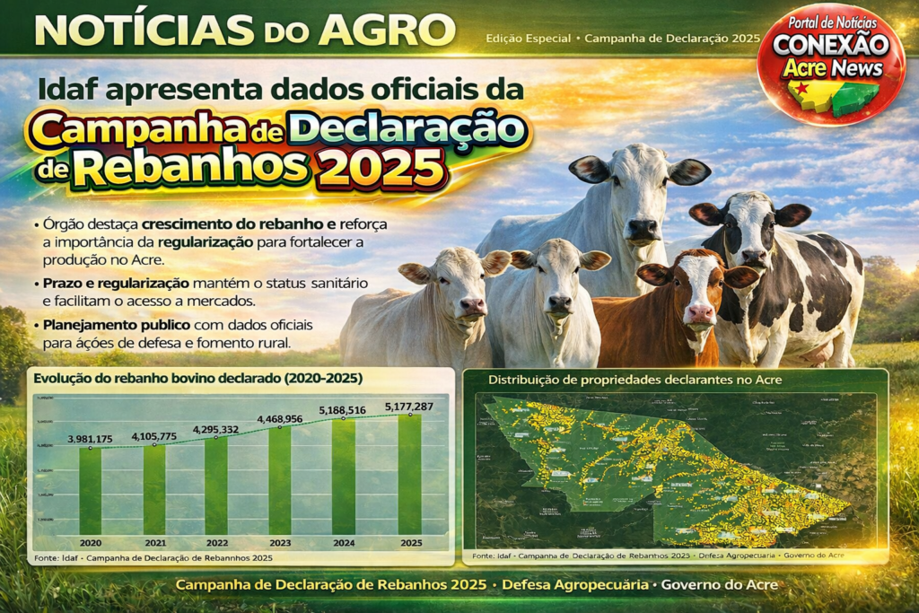 O governo do Acre, por meio do Instituto de Defesa Agropecuária e Florestal do Acre (Idaf), divulgou os resultados consolidados da 9ª Campanha de Declaração de Rebanhos de 2025, encerrada em 31 de dezembro. Os dados evidenciam um cenário positivo para a agropecuária acreana, com avanços significativos no controle sanitário, no monitoramento zootécnico e no fortalecimento da produção rural em todo o estado.